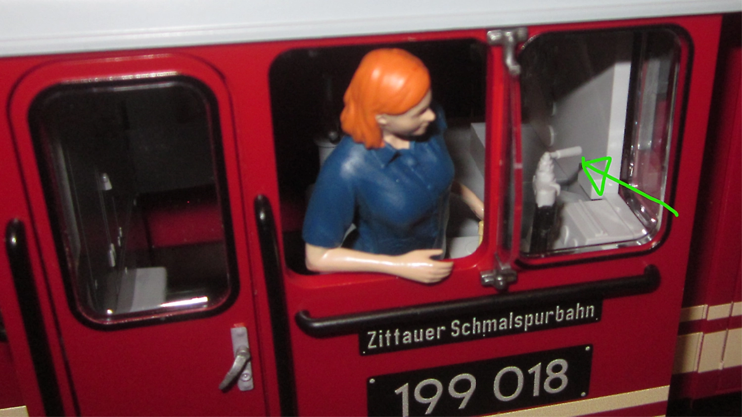 „Das größte Problem war, Nicole zu montieren“, schrieb er uns. „Meine Wurschtfinger sind dafür mittlerweile schon etwas zu steif. Es hat ´ne gute Stunde gedauert, um Nicole in ihrer richtigen Position festzuschrauben. Wenn die Zinnfigur mal wieder beim Aufrichten in der Kabine umfällt, geht das Gefrickel erst so richtig los. Mit einer Telefonzange und mit Powertape umwickelten Backen konnte ich sie dann in Position bringen. Der Bremslüfthebel hat dabei leider auch etwas gelitten, aber noch hängt er am Ventil (Anm.: siehe grünen Pfeil im Bild unten). Meine Frau stand nur noch daneben und hatte Tränen in den Augen vor Lachen, anstatt darauf aufzupassen, wo dieses Schräubchen zum x-ten Mal runterfiel. Sie wurde allerdings auch schon langsam eifersüchtig ob meiner Bemühungen um Nicole…“