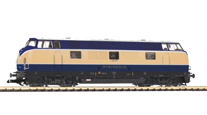 Ein Sondermodell der Händlervereinigung “Die Modellbahnexperten” nimmt Bezug auf die frühen 1960er Jahre der Deutschen Bundesbahn, als Luxuszüge wie der Rheingold nicht durchgehend mit Elektroloks bespannt werden konnten. Was im Maßstab H0 schon längst thematisiert ist, ermöglicht Piko jetzt mit seinem G-Modell der DB-Baureihe V200.1 / BR 221. Luxuriöses Reisen auf Gleisen war ein Statement, dass auch der Weg das Ziel war. Dass die Reisenden innen ein stilvolles Interieur erwartete, wurde außen gerne mit besonderen Farbdesigns kenntlich gemacht. Etwa beim Rheingold, der 1928 von der Deutschen Reichsbahn auf die Reise entlang des Rhein geschickt wurde. Grundfarbe war ein helles Violett mit einem hellbeigen Fensterband. Bei der Deutschen Bundesbahn entwickelte sich