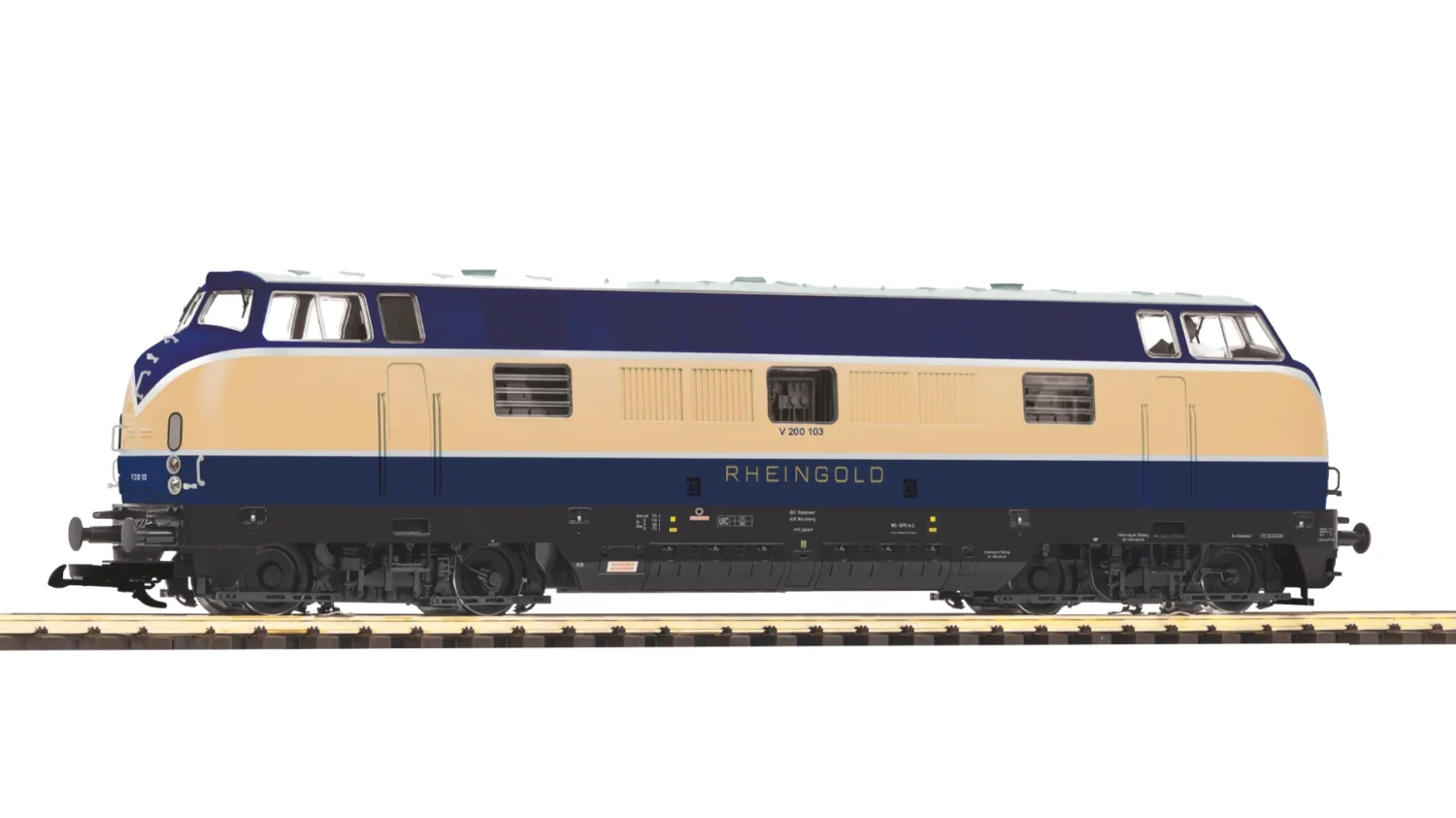 An den Rheingold erinnern immer wieder Lok-Sondermodelle, die als Händler-Exklusivausführungen aufgelegt werden. Im Maßstab 1:87 (H0) sind diese V200-Modelle sehr geläufig, in Spur G nun neu: Die Händlervereinigung „Die Modellbahnexperten“ kündigt eine V200 im blau-beigen Rheingold-Design von 1962 an und nimmt als Basis das jüngst erschienene Spur G-Modell der BR 221 (V200.1) von Piko. Das Projekt gibt die Lok V 200 103 mit der Aufschrift “RHEINGOLD” wieder, erhältlich in analoger wie digitaler Soundausführung, derzeit zu den aktuellen Preisen des Serienmodells im Angebot. Bestellungen für das limitierte Modell sind schon jetzt möglich, voraussichtlicher Liefertermin ist Mai 2026. Infos und Händler-Links über www.modellbahnexperten.com