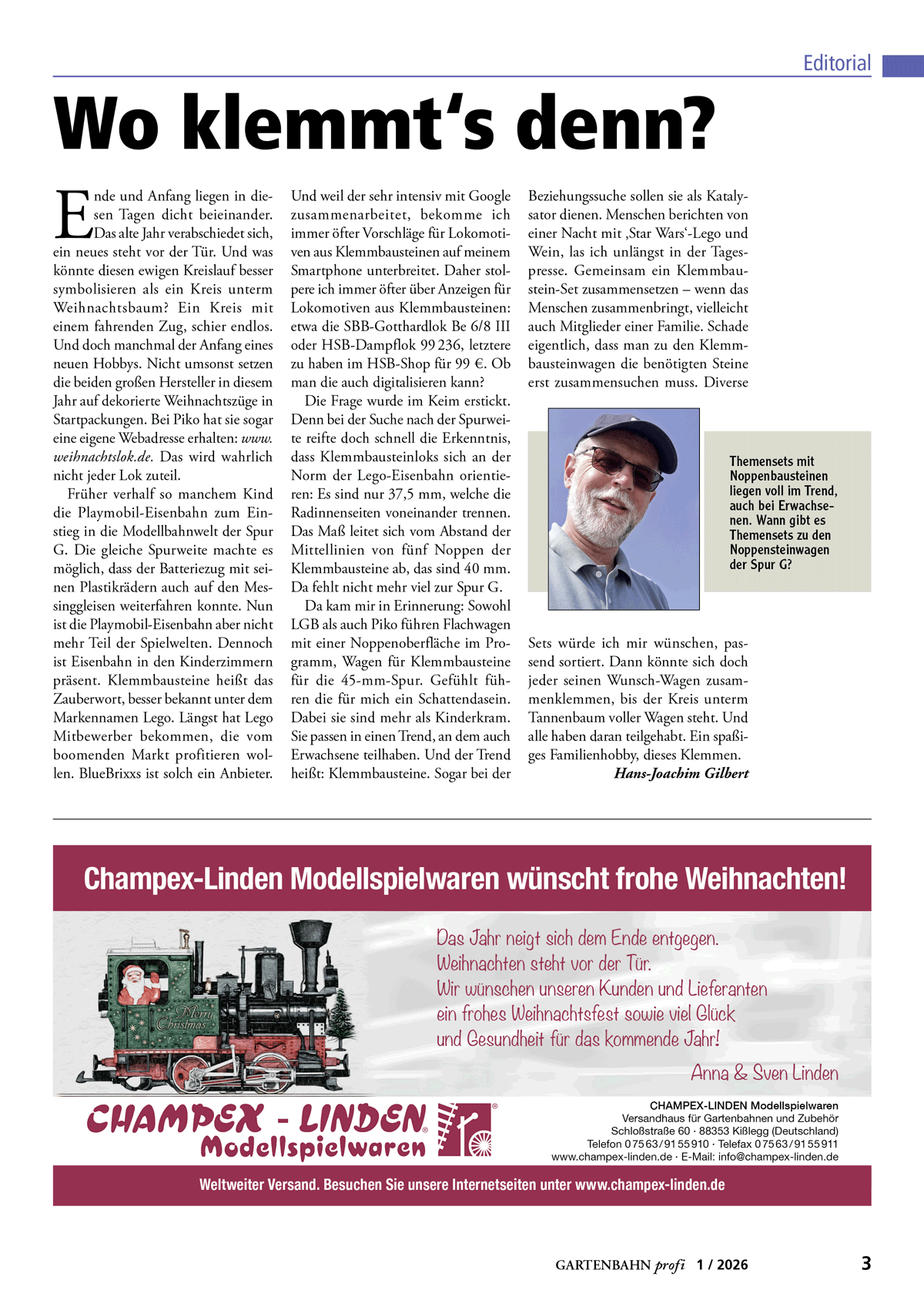 Gartenbahn Profi ist das Magazin von Modellbahnern für Modellbahner und lebt vom Mitmachen. Stammautoren geben hier ihr verlässliches Wissen. Aber auch Leser, die über praktische